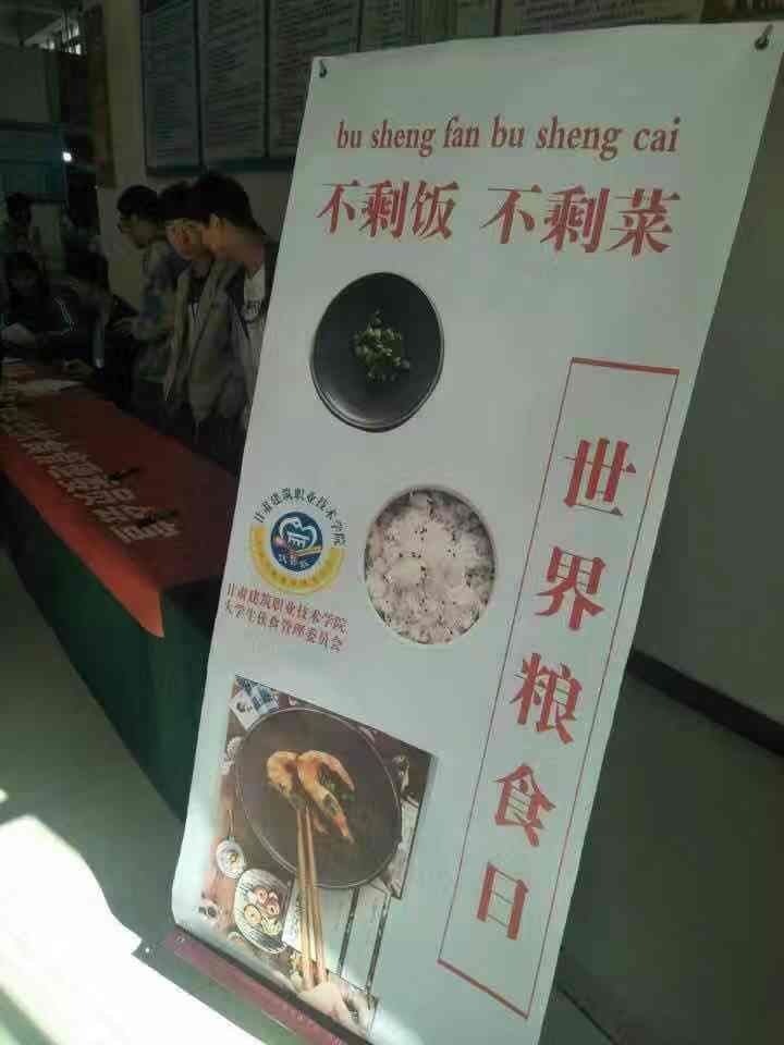 为培养我院学生在学习生活中节约粮食的良好习惯,增强爱粮节粮的意识,2019年10月16日甘肃建筑职业技术学院大学生伙食管理委员会举办了“节约粮食,人人有责”主题签名活动,活动在校本部第一食堂大厅开展。学院党委书记、院长王娟丽,党委委员、副院长许洁,院办主任、组织人事处处长张长颖,团委书记张磊,后勤处处长李泰儒等莅临现场,并对此次活动的开展给予了高度的评价与支持。