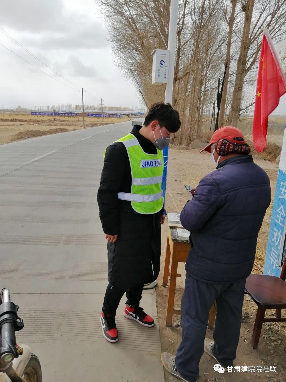 “师傅,您好,请靠边停车,我们需要进行体温测量,谢谢。”这句话变成了大学生社团策划监督部刘金广同学的一句口头禅,自从防疫战斗打响以来,刘金广同学便成为了毛井镇大户掌村口一道靓丽的风景线,他每天的工作便是在临时搭建的防疫站协助村干部,村医生对进出人群进行体温测量,信息登记,并对疫情防控知识进行宣传和讲解。根据刘金广同学的描述,临时搭建的防疫站再加上每天的寒风导致环境确实比较艰辛,但是一想到能为家乡的防疫工作做出一些贡献,心里就热烘烘的。