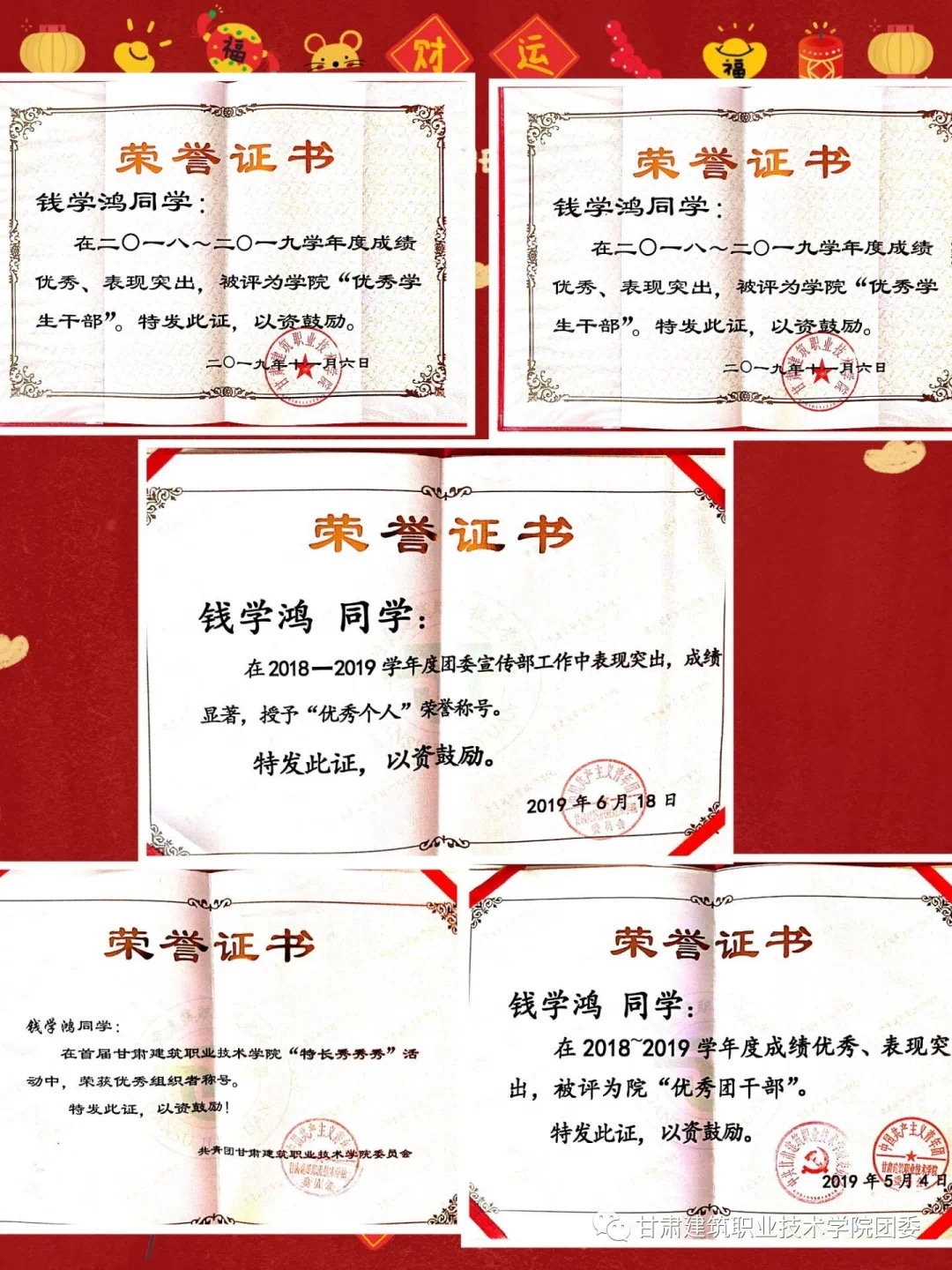 测绘地理信息技术系工程测量一班的钱学鸿,在班级中担任宣传委员,初一时就积极加入共青团,2019年9月当选为学院团委宣传部副部长。在2018至2019年度被评为“优秀团干部”同年十一月被评为“优秀学生干部”。遵守学院的各项规章制度,具有良好的思想道德品质,各方面表现良好,有强烈的集体荣誉感和工作责任心。工作上表现突出,2019年6月荣获“优秀个人”,学习上一直勤奋刻苦,积极参加社团和班级举行的各种活动,在社团活动特长秀秀秀中荣获“优秀组织者”称号。