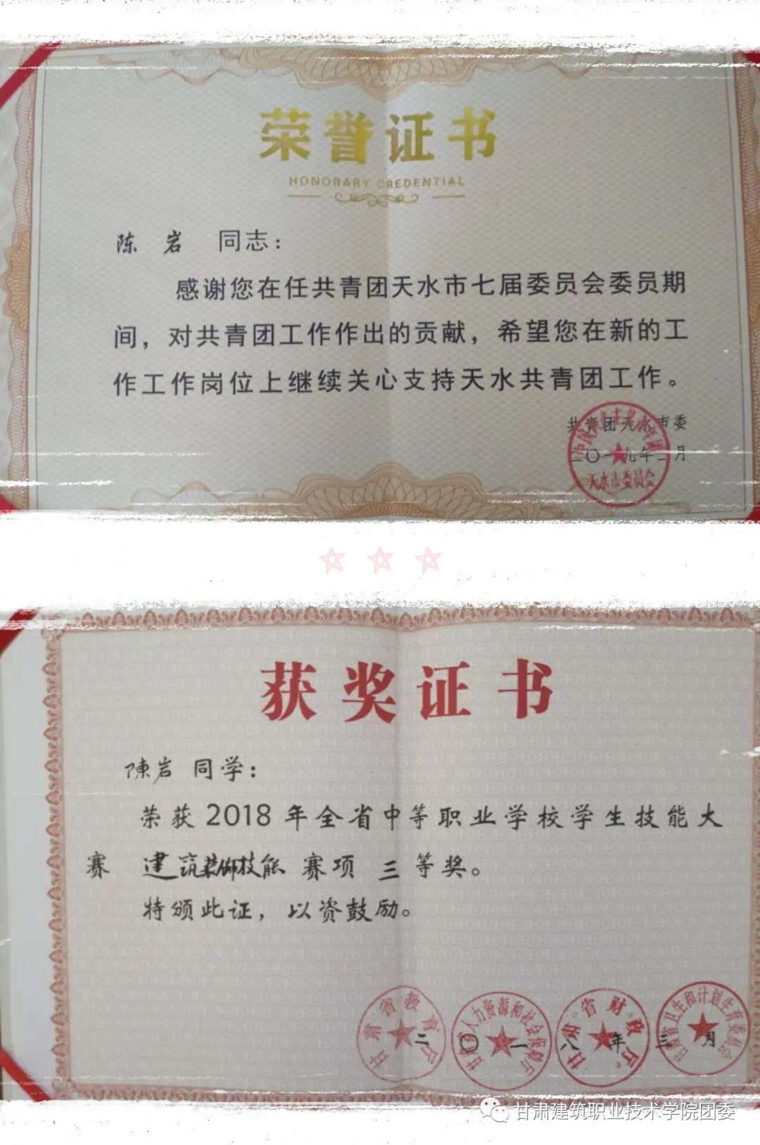 陈岩,团员,曾任共青团天水市第七届委员会委员,现任院团委组织部外联组组长。曾获得市级技能竞赛二等奖,省级技能竞赛三等奖,“优秀团干”等。作为学生干部,他工作上吃苦耐劳、具有良好的团队合作精神;思想上积极上进;为人热情诚恳。积极参加学校组织的各项活动,并不断提高自身业务能力和综合素质;在生活上,积极乐观,有较好的分工合作能力,能和同学友好相处,互帮互助共同进步。陈岩在全市中等职业学校学生技能大赛中荣获建筑装饰技能项目二等奖;荣获2018年全省中等学校学生技能大赛建筑装饰技能比赛三等奖等。