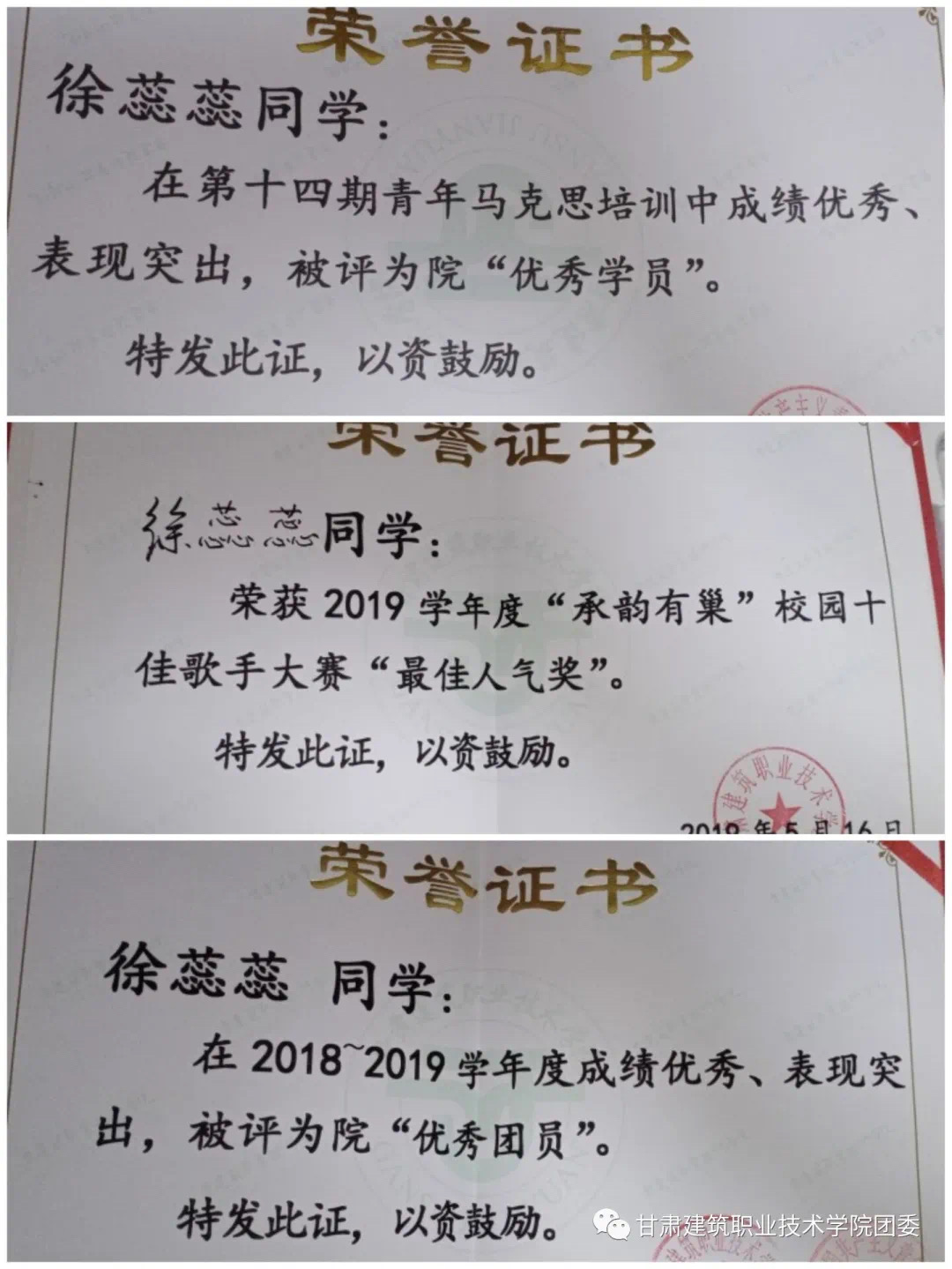 在建院求学期间,建筑经济管理系 工程造价4班徐蕊蕊同学在2018~2019学年荣获“优秀团员”称号;在2018~2019学年荣获“优秀学生干部”称号;在校园十佳歌手比赛中获得“最佳人气奖”;在2018~2019学年荣获“国家励志奖学金”,在第十四期青年马克思培训中被评为院“优秀学员”,在获得这些奖项后,她始终怀着一颗热情的心,认真学习,刻苦钻研课内知识,力求将自己的基础夯实牢固。工作中同样是尽心尽责,不敢有一丝懈怠,怀着充分的责任感始终尽善尽美完成各项任务,为营造积极向上团结奋进的班级和社团不懈努力。同时积极参加有关志愿者的许多活动,并以一名新世纪团员的要求时刻鞭策自己,始终坚持自强不息,立志成材的信念,始终保持着昂扬的斗志和坚韧不拔的作风,坚定不移地朝着既定的奋斗目标前进。
