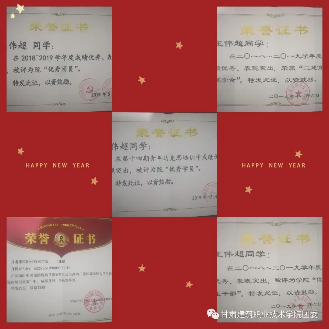 环境与市政工程系 市政工程技术一班王伟超同学自入校以来不断端正自己的学习态度,积极进取,团结同学,在完成自己学习目标的同时,不忘帮助班级内的其他同学,积极参加学院及各学生组织举办的活动,从各个方面不断锻炼自己,为自己打下了深厚的基础。并于2018~2019学年先后被评为学院“优秀团员”、“优秀学生干部”第十四期青马课培训学院“优秀学员”,荣获“二建育才奖学金”、“第四届全国大学生预防艾滋病知识竞赛”优秀奖。他曾说:这些奖项既是学院对自己的认可,同时也是鞭策,让自己积极进步,帮助同学的信念更加坚定。自己不会止步于此,而是秉承自己的初心,向着自己的理想前进。