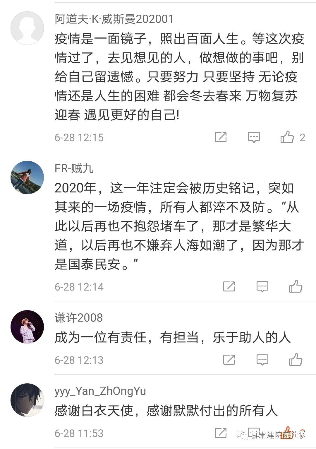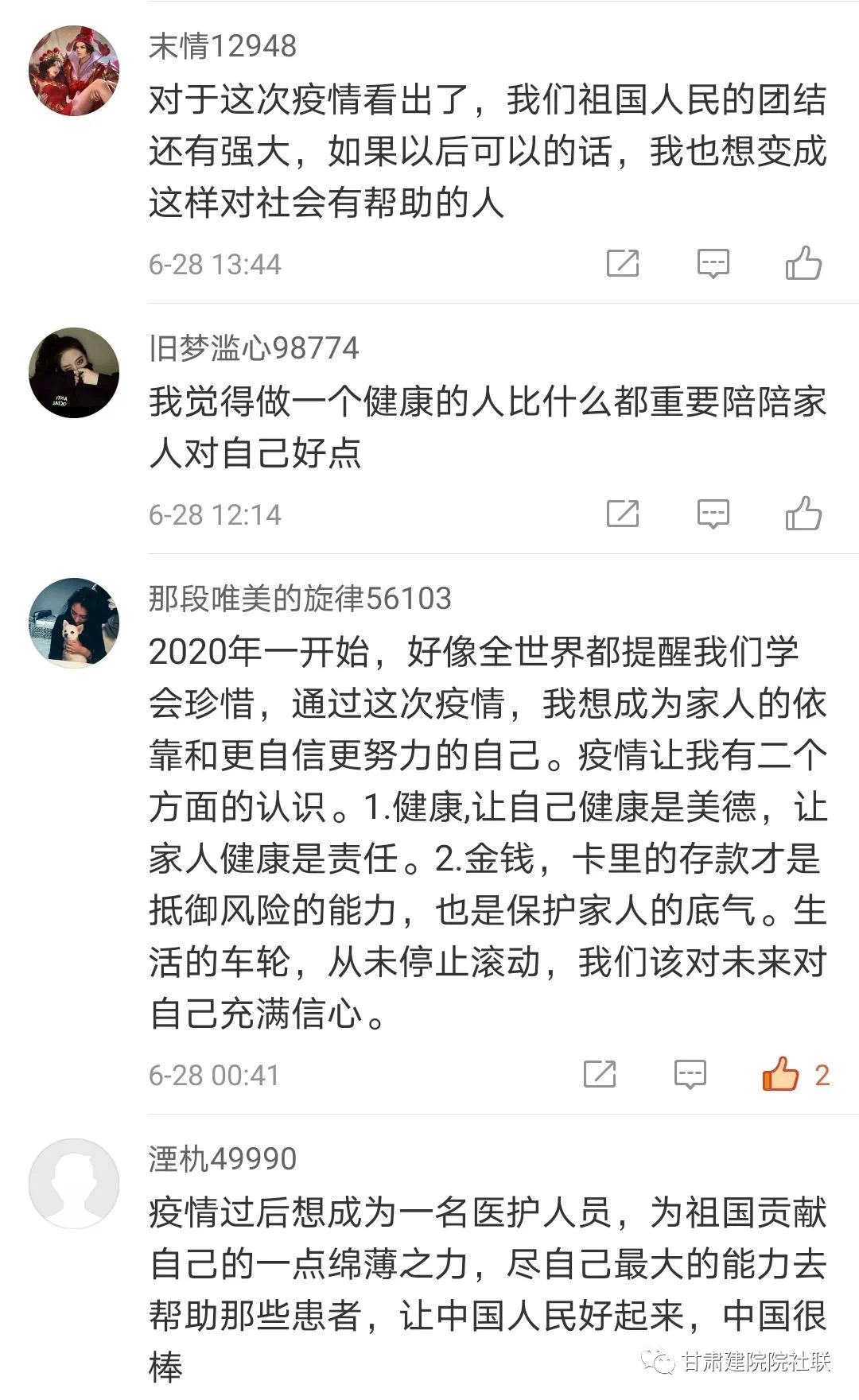 随着线上活动的开始,大家都关于本次主题纷纷留言,你一句我一句,积极的讨论自己对这个问题的看法,在微博评论区;大家对符合自己见解的评论踊跃点赞, 从中可以看出,这次疫情给同学们带来的感触颇深。
