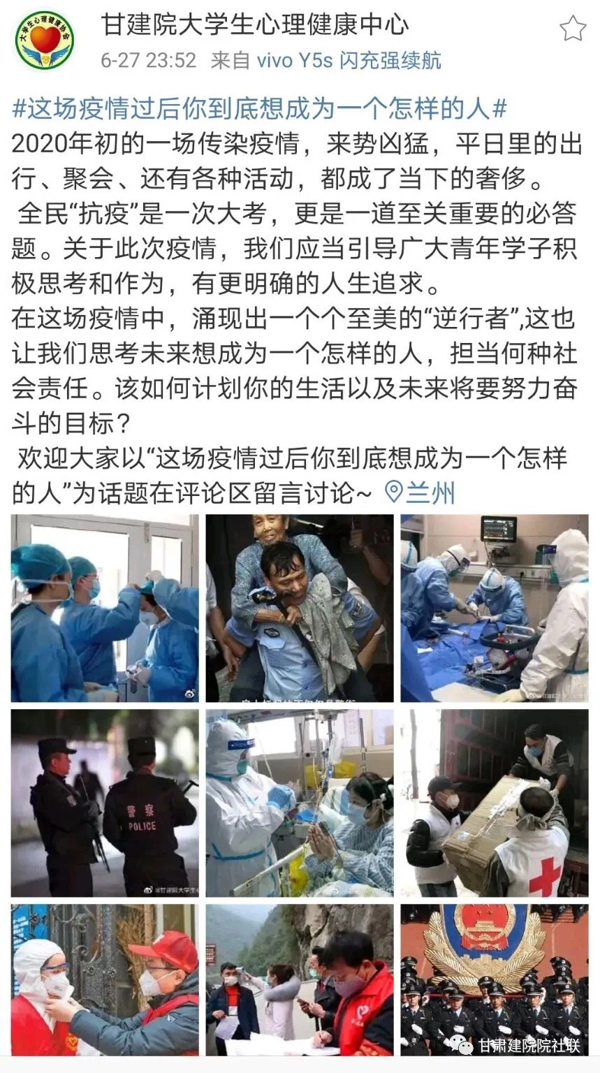 2020年是注定不平凡的一年。当人们正要沉浸过年的喜悦中时,一场疫情的到来打破了这一切宁静,与此同时涌现出一大批奔赴疫区的人,他们的英雄事迹牵动着每个人的神经,此次疫情给每个人都带来了一定的思考,作为新一代的青年,为了让同学们学习这次抗疫英雄们身上的优秀品质,重新思考要成为怎样的一个人,该为社会做些什么,未来该有怎样的人生追求及目标,为了明确这一系列的思考,2020年6月28日大学生心理健康协会开展了微博线上讨论“疫情过后你想成为怎样的人”主题活动