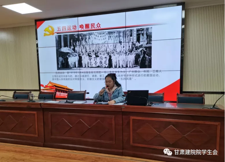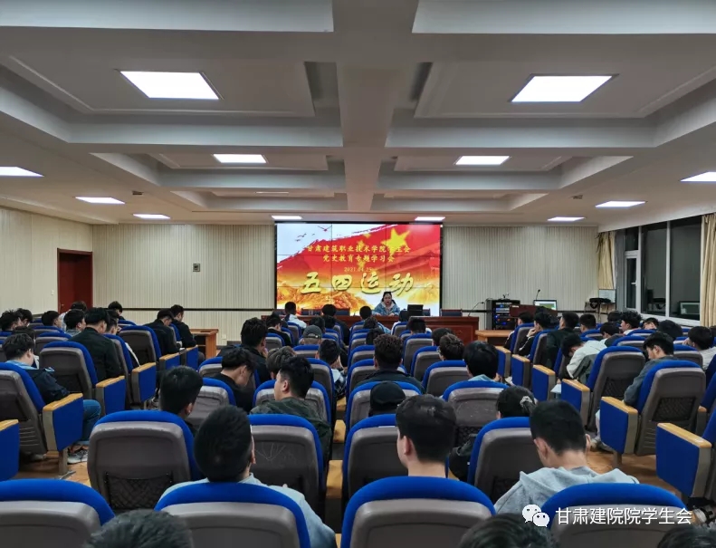 今年是五四运动102周年,更是中国共产党成立100周年,根据《共青团中央关于在全团开展“学党史、强信念、跟党走”学习教育的通知》要求,为落实学联学生会组织要广泛发动所联系的青年开展党史学习的工作要求,力求做到覆盖全部学生会工作机构、覆盖全体学生会工作人员,在青年学生中发挥带动表率作用。在第72个五四青年节到来之际,甘肃建筑职业技术学院两级学生会于2021年4月25日晚在学术报告厅集中开展了“五四运动,唤醒民众”为主题的党史教育专题学习会。