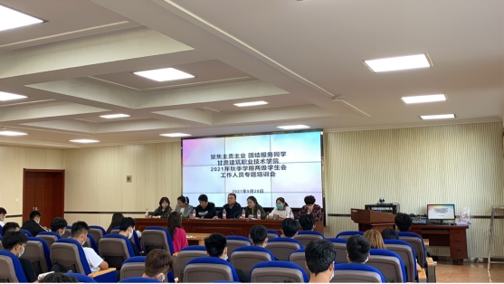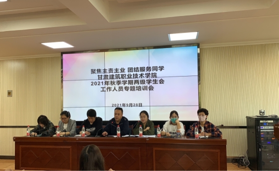 为严格落实学生会工作人员培训制度,以学生会制度落实为牵引持续深化高校学生会改革,深入贯彻落实从严治会制度,优化学生会组织工作作风,切实加强新时期学生会工作,甘肃建筑职业技术学院两级学生会以“聚焦主责主业,团结服务同学”为主题于2021年9月28日~29日在学术报告厅召开“甘肃建筑职业技术学院2021年秋季学期两级学生会工作人员专题培训会”。团委书记张磊、六系团总支负责人以及两级学生会全体工作人员参加此次会议,会议由学生会专职秘书长董梓瑶主持。