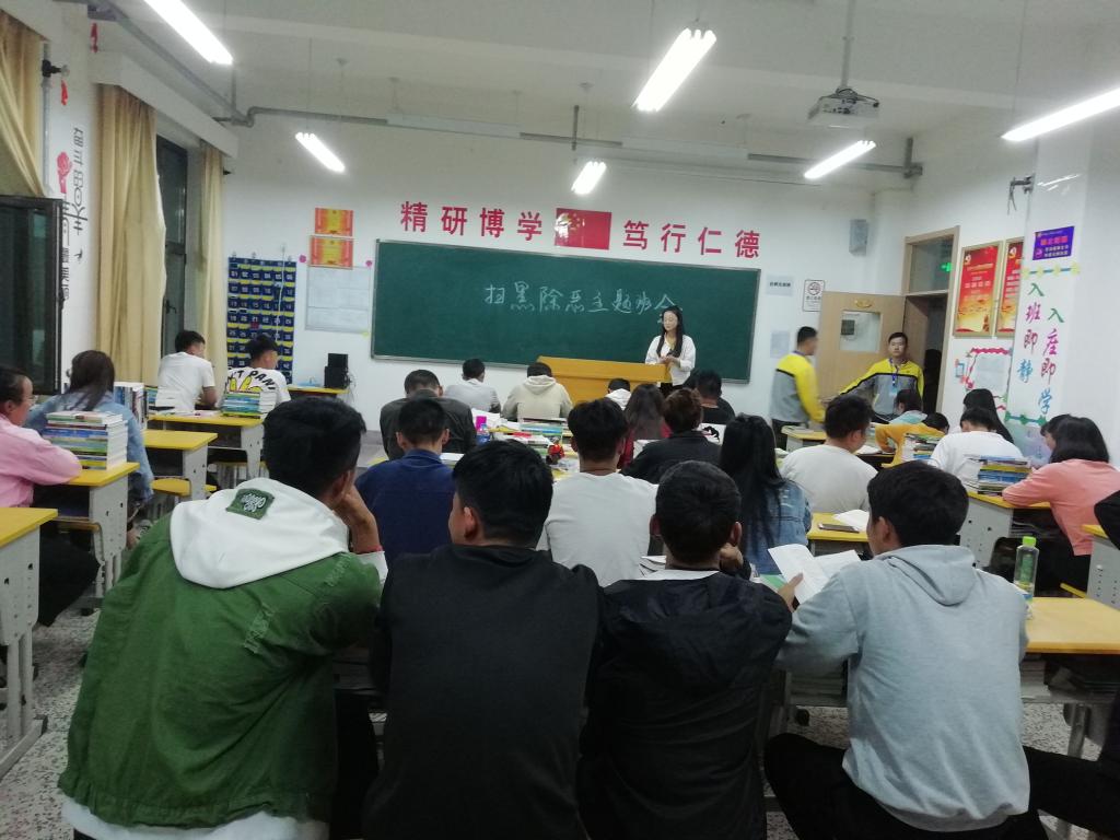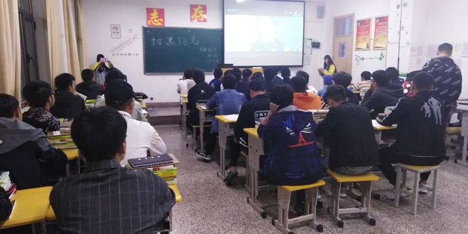 晚自习期间,通过观看视频等形式向同学们宣传黑恶势力的危害,以及学院扫黑除恶工作领导小组办公室举报电话,同时请广大同学们积极举报非法扰乱教育教学秩序、干扰阻挠学校建设、侵害师生生命财产安全和合法利益、敲诈勒索学生财物、学校周围违规摆摊设点、占道经营、违规经营、无牌无证和农村五小车辆拉载学生以及各类非法宗教组织和邪教组织拉拢渗透等各个方面的涉黑涉恶涉乱行为。