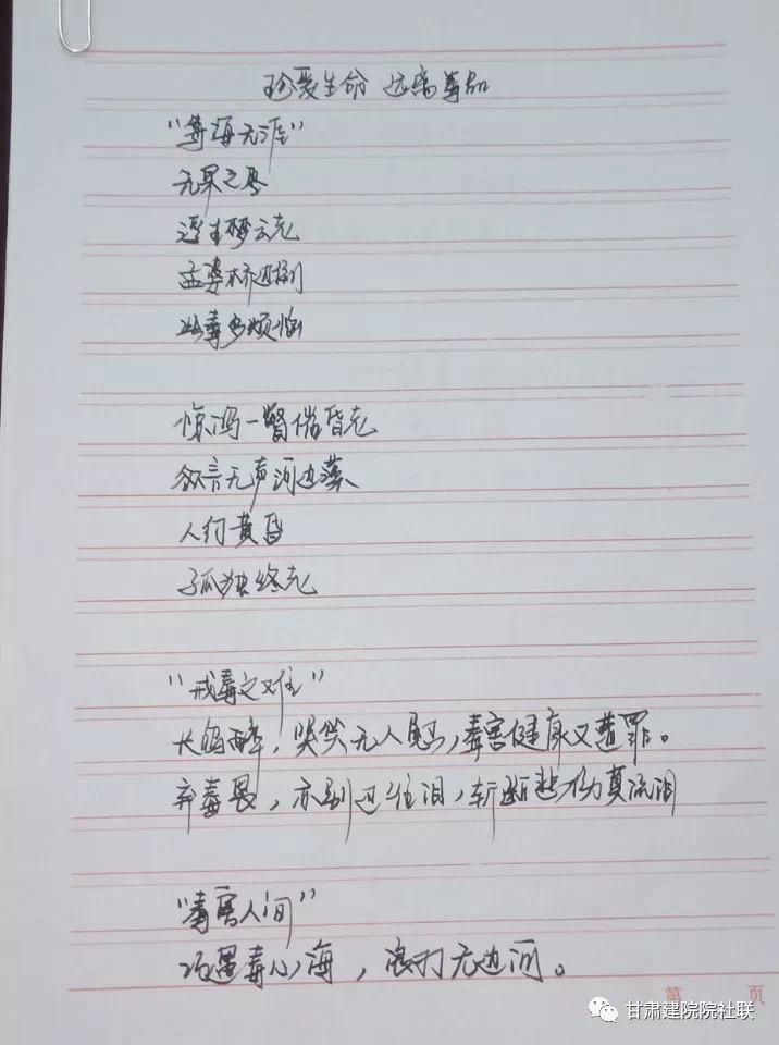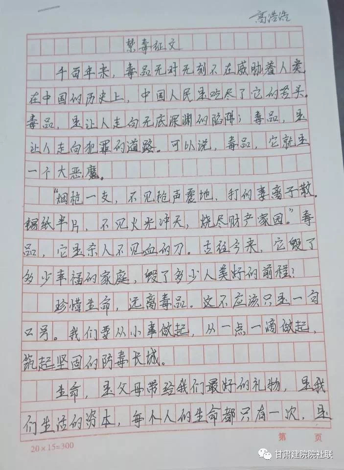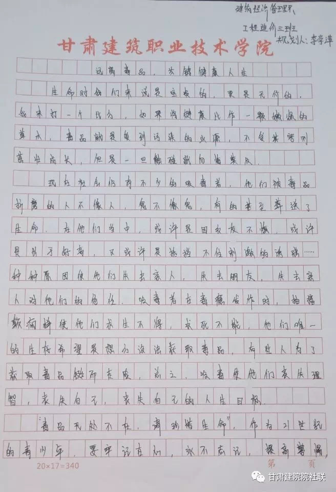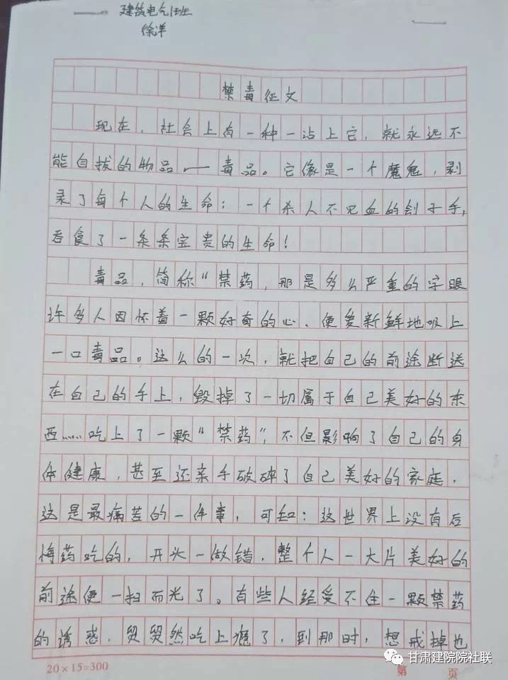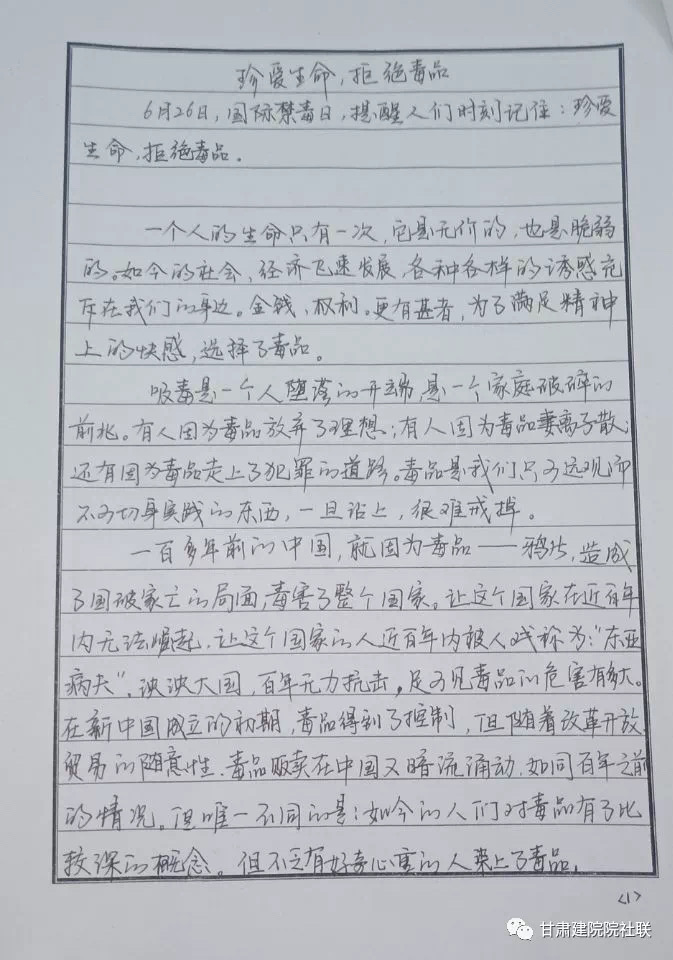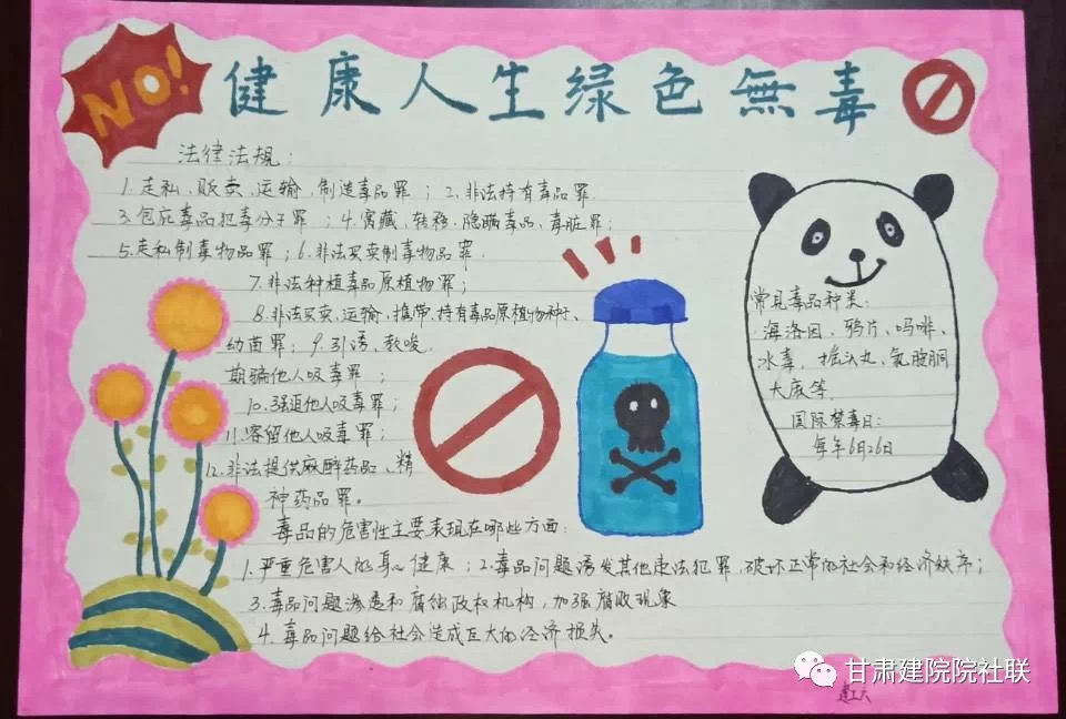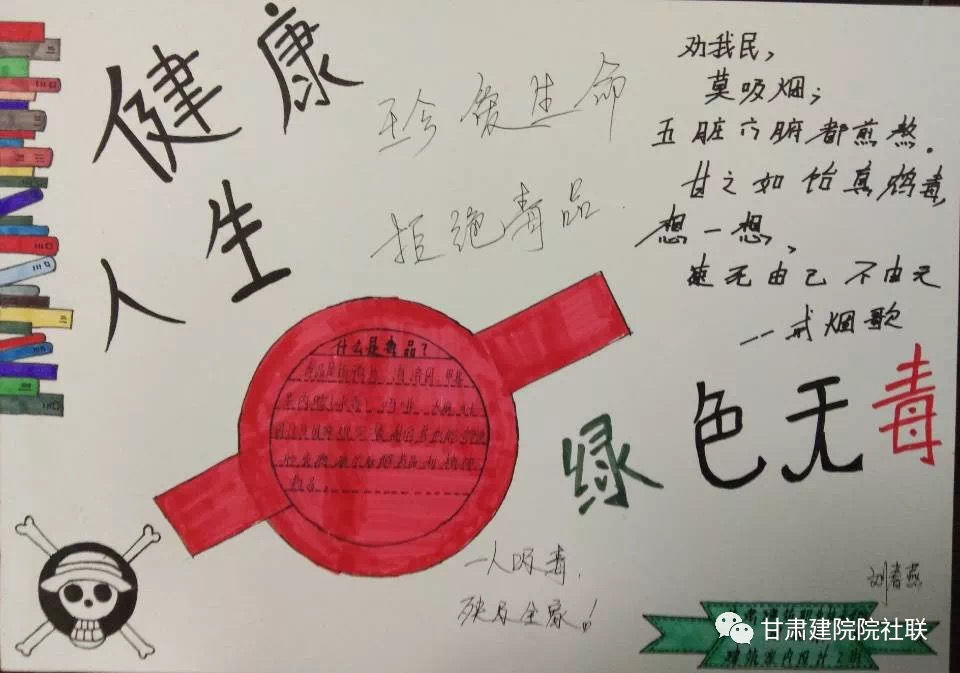 活动以“健康人生、绿色无毒”为主题,结合庆祝新中国成立70周年,以征文、书法、手抄报或海报的形式进行主题作品征集,以此来加强同学们对毒品的认知和防范意识,在此次作品征集活动中,同学们都能够积极参与且征文内涵丰富。