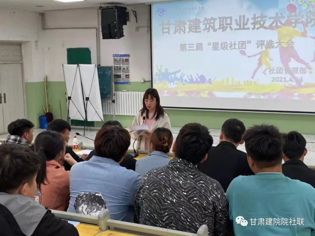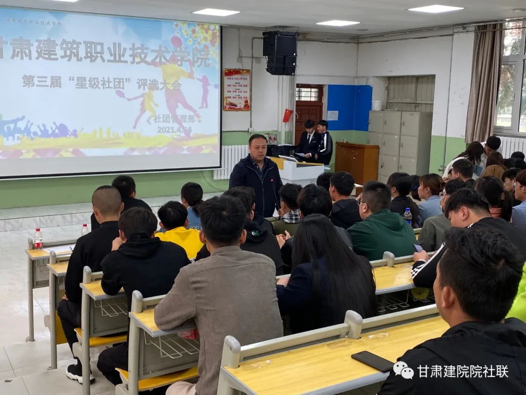2021年4月14日中午在校本部阶梯一教室举行第三届星级社团评选暨学生社团年度考核大会。学院学生社团建设指导委员会成员、学生社团指导老师参加会议。会议由团委社团管理部张瑶老师主持。